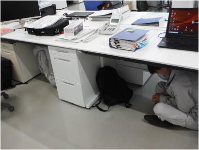 シェイクアウト訓練の最大の特徴は「どこでも、誰でも参加できる訓練」ということです。決められた時刻に参加者全員が一斉に机の下に隠れるなど身の安全を図る行動を実践します。